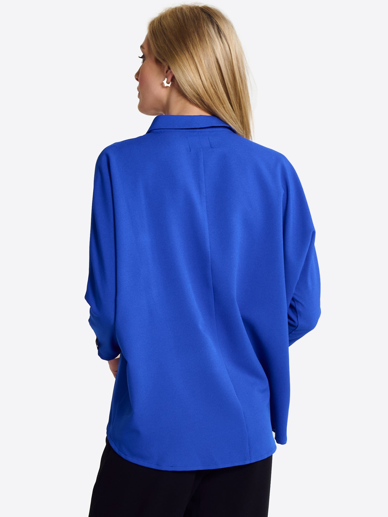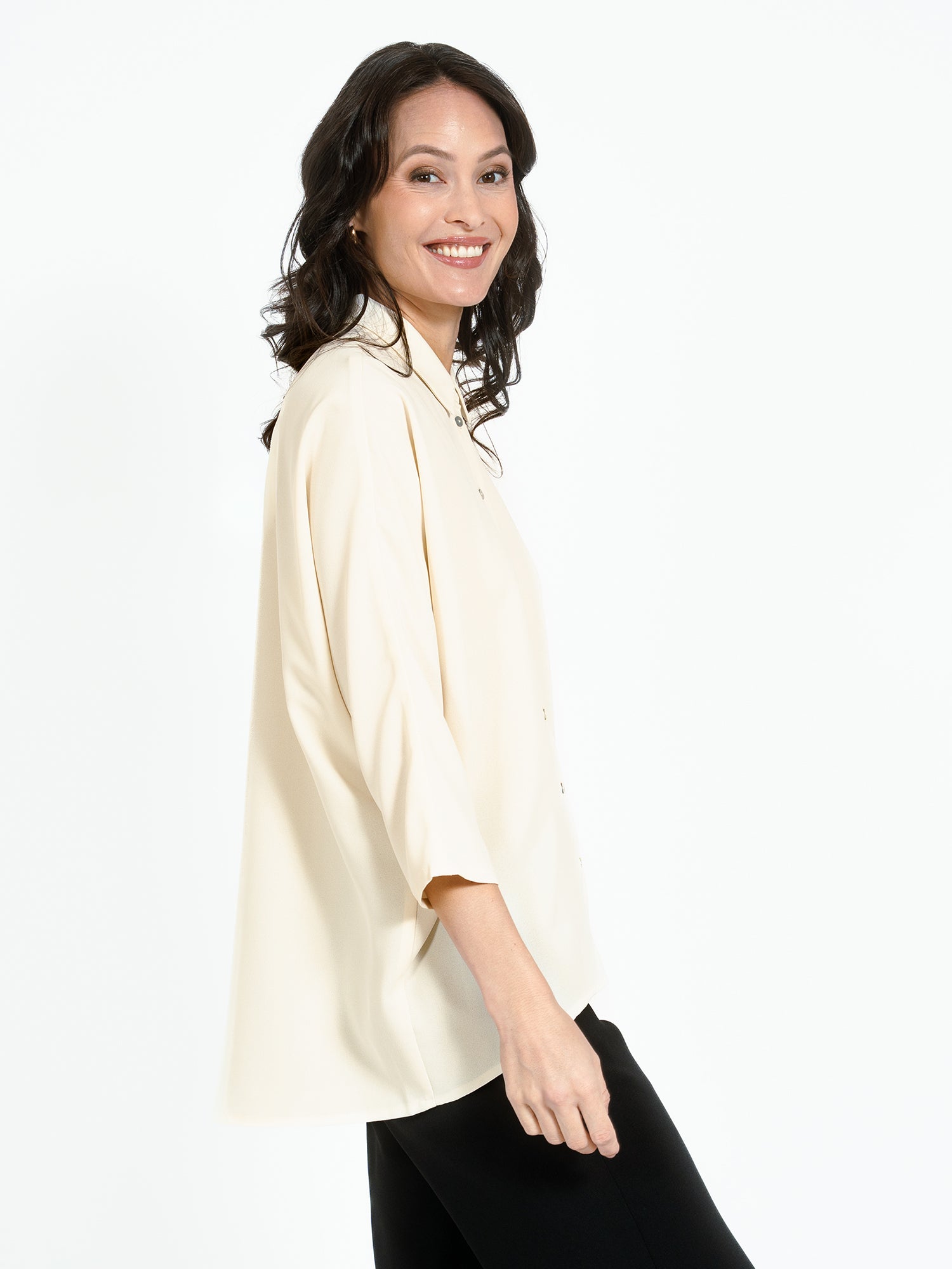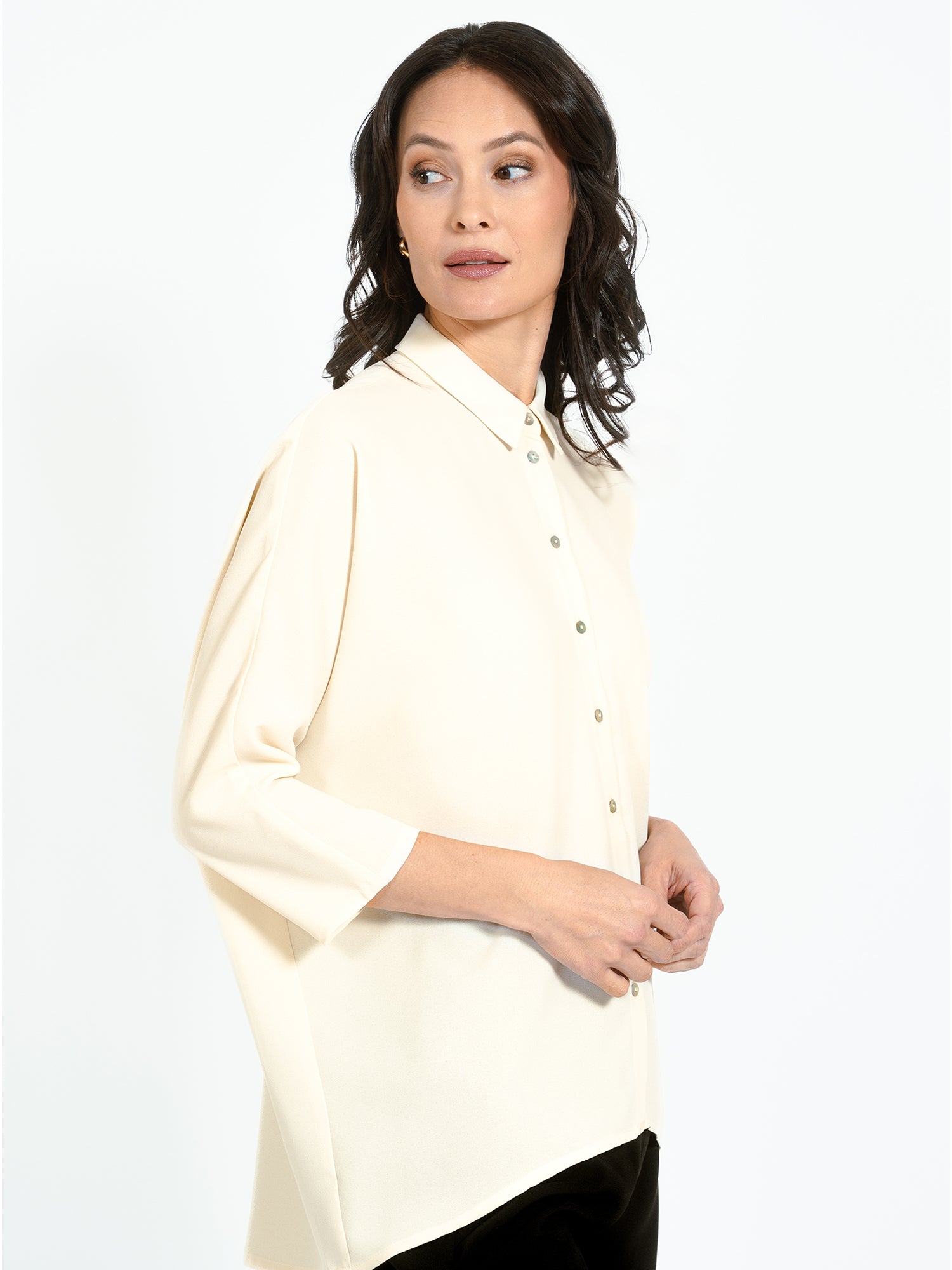 Shirt in soft recycled polyester from Jascha Stockholm. Oversize model with button fastening at the front and three quarter length sleeves. The shirt is a little longer at the back than the front.